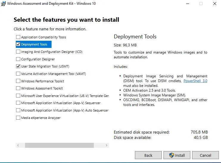 Bu araçlar arasından, kurulum için özellikle “Deployment Tools” ve “User State Migration Tool (USMT)” bileşenlerini seçiyoruz. Seçimimizi yaptıktan sonra ‘Install’ butonuna tıklayarak kurulum sürecini başlatıyoruz.