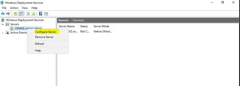 Kurulum işlemimiz tamamlandı, şimdi Server Manager ekranından Windows Deployment Services konsolumuzu açabiliriz. WDSKonsol üzerinde Serversaltında bulunan WDSsunucumuza sağ tıklayarak “Configure Server” adımına gelmemiz gerekmektedir.