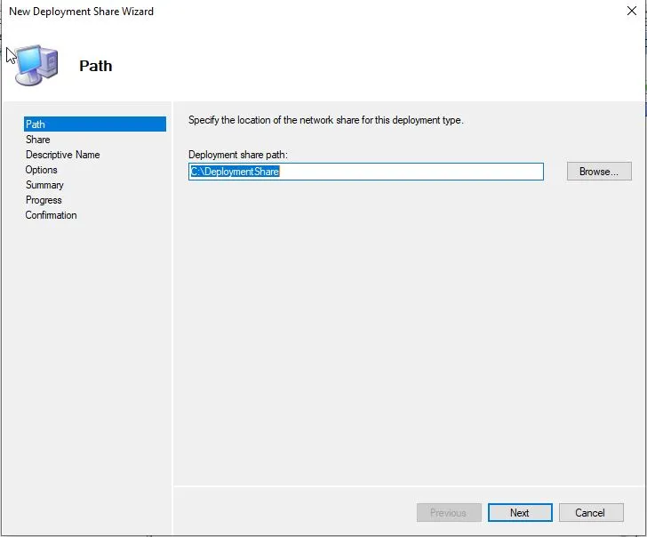 New Deployment Share Wizard üzerinde ilk bölüm Patholarak gelmektedir, Deployment Share için kullanacağımız sürücü ve klasör yolunu belirtmemiz gerekmektedir.