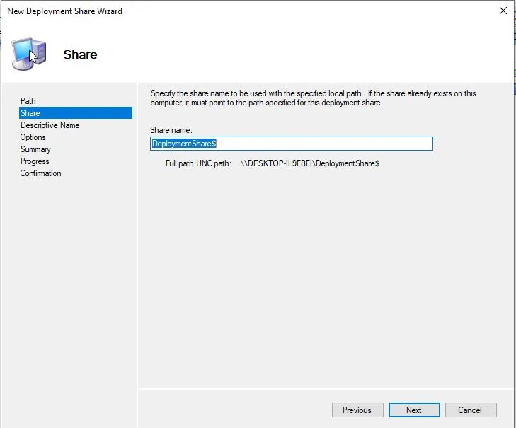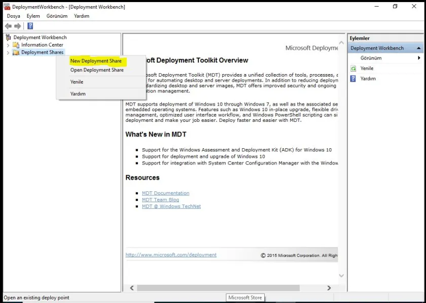 - Sol menü üzerinde bulunan Deployment Shares objesi üzerinden New Deployment Share ile işlemlerimize başlayabiliriz.
