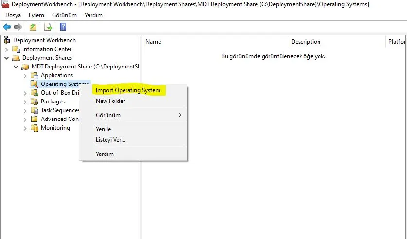 Deployment Workbench – Deployment Shares – MDT Deployment Share altındaOperating System ile Import Operating System diyoruz.