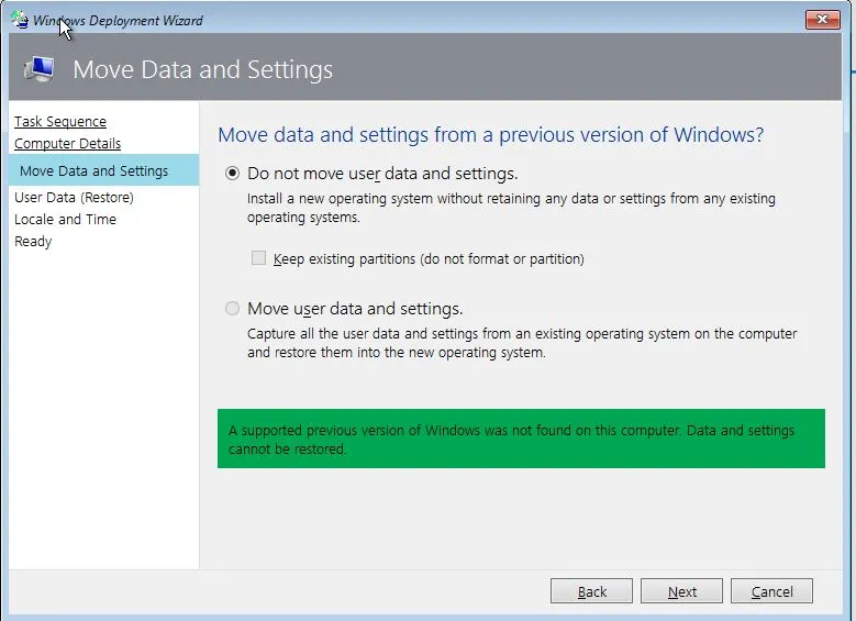 Sıfır kurulum yaparken, mevcut kullanıcı verilerini ve ayarlarını taşımamak için “Do not move user data and settings” seçeneğini tercih ediyorum. Bu seçenek, yeni bir işletim sistemi yüklerken eski kullanıcı verilerinin ve ayarlarının üzerine yazılmamasını sağlar, böylece temiz bir kurulum gerçekleşir.