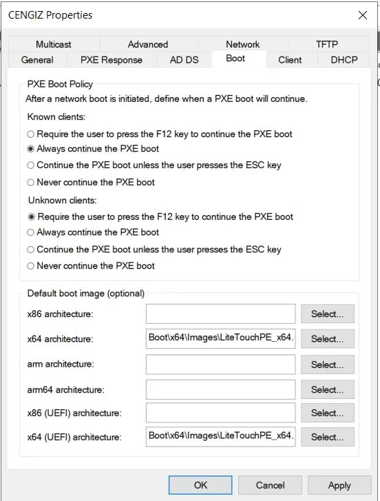 Properties sayfasında, “Boot” sekmesini açıyoruz. Burada, PXE boot süreci için iki önemli ayar yapmaktayız. “Known Client” ayarı için “Always continue the PXE boot” seçeneğini işaretliyoruz; bu sayede sistem daha önceden tanınan kullanıcıları doğrudan kuruluma yönlendirir. “Unknown Clients” için ise “Require the user to press the F12 key to continue the PXE boot” seçeneğini belirliyoruz. Bu ayar, tanınmayan kullanıcıların PXE boot işlemini başlatmak için F12 tuşuna basmalarını gerektirir ve böylece kullanıcıların kimliğini doğrulamadan önce bir kontrol noktası sağlar.