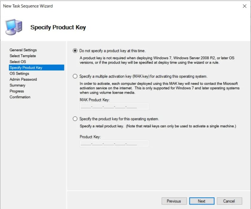 - Do not specify a product key this time: Eğer Volume License kapsamında bir KMS (Key Management Service) ürün anahtarına sahip bir sistem kuruyorsanız, bu seçeneği işaretlemelisiniz. KMS, birden fazla cihazın bir ağ üzerinden lisanslanmasını kolaylaştıran bir yöntemdir.