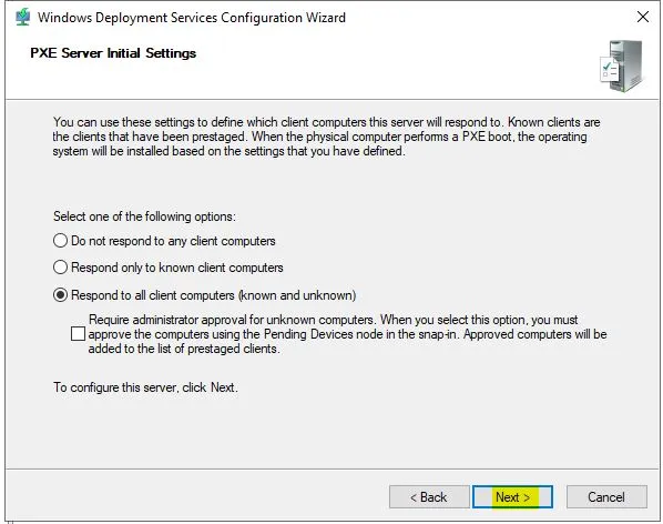 Bu bölümde, PXE aracılığıyla IP adresi alarak bağlanan cihazlardan hangilerine işletim sistemi imajının teslim edileceği belirlenmektedir. “Respond to all client computers” seçeneğini işaretlemek, bilinen ve bilinmeyen tüm cihazlara imaj dağıtımı yapılacağı anlamına gelir. Ben bu seçeneği tercih ediyorum.