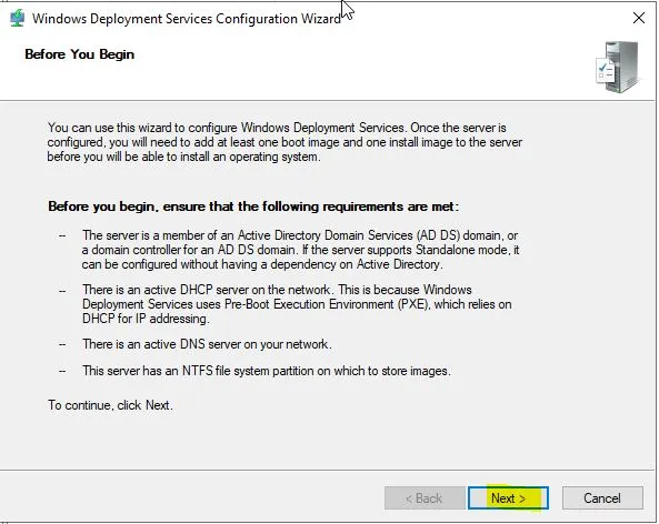 Windows Deployment Services Configuration Wizard pencersi açılıyor ve bize gerekli olan gereksinimler için uyarıda bulunuyor. Bu adım da Next diyerek devam edebiliriz.