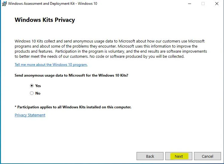 Windows Kits Privacybölmünü “Yes” olarak işaretliyoruz ve Nextile Windows Assessment and Deployment Kit (ADK) kurulumuna devam ediyoruz.