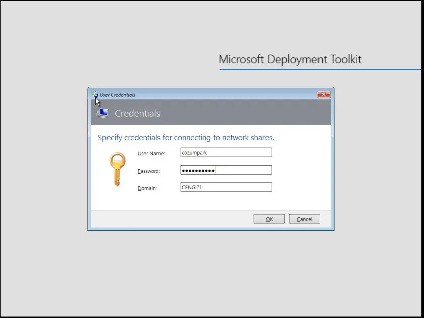 Gerekli tüm yapılandırma işlemlerini tamamladıktan sonra, artık Windows 10 işletim sistemini ağ üzerinden başlatarak (network boot) kurabilirsiniz. Kurulum süreci sırasında sistem, kullanıcı adı ve şifre bilgilerinizin girilmesini talep edecektir. Kurumunuzun politikalarına ve ortam yapısına bağlı olarak, isterseniz domain kullanıcı bilgilerinizi de kullanabilirsiniz.