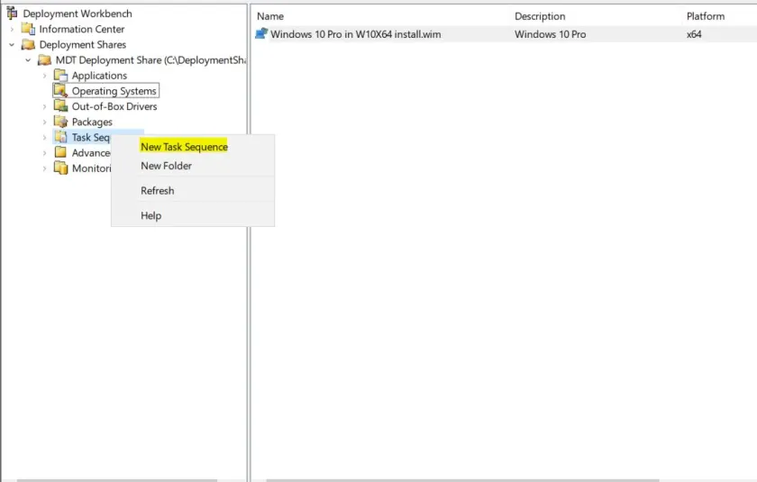 Deployment Workbench – Deployment Shares – MDT Deployment Share – Task Sequence – New Task Sequence