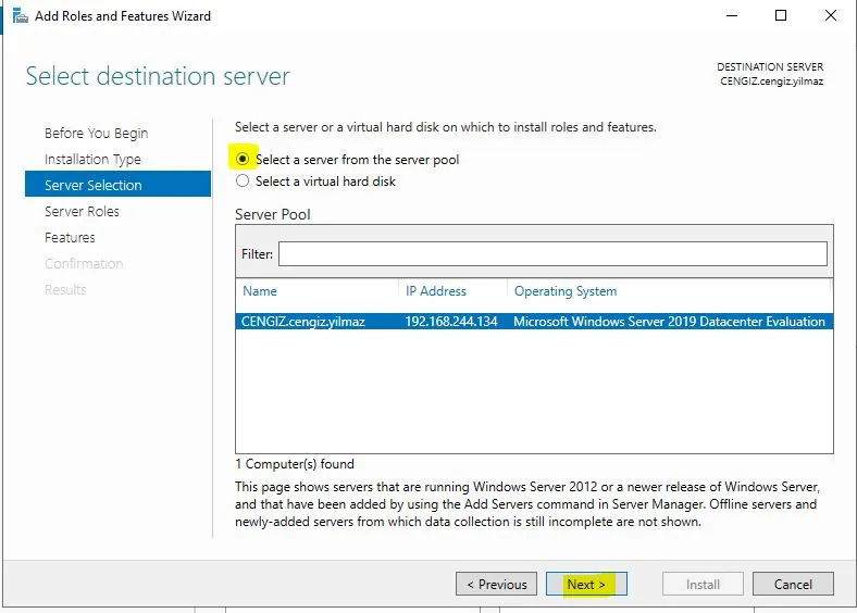 Server Manager üzerinde eklemiş olduğumuz başka bir sunucu bulunmuyor ise “Select destination server” bölümün de kendi sunucumuzu işaretleyerek Next ile devam etmemiz yeterlidir.