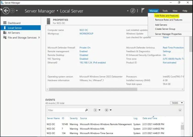 Sunucumuzun gerekli yapılandırmalarını tamamladıktan sonra, Server Manager konsolunu açıyoruz. Sağ üst köşede yer alan “Manage” menüsünden “Add Roles and Features” seçeneğini kullanarak rol ekleme sihirbazını başlatıyoruz.