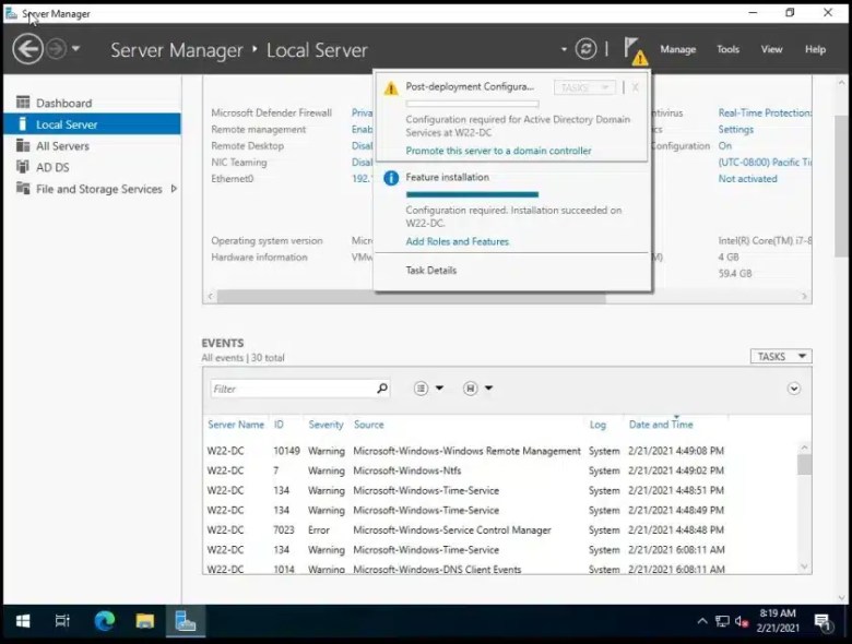 Kurulum tamamlandıktan sonra Server Manager konsolunu açıyoruz ve burada Active Directory Domain Services rolünün başarıyla kurulduğunu ancak yapılandırılması gerektiğini görmekteyiz.