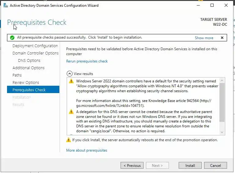 - Prerequisites Check ekranına geçiş yapılır. Bu ekran, Windows Server 2022 üzerinde Active Directory Domain Services rolünün kurulumu için gerekli ön koşulların kontrolünü yapar. Sistem, gereken tüm gereksinimleri kontrol eder ve herhangi bir eksiklik veya potansiyel sorun olup olmadığını tespit eder. Eğer tüm ön koşullar başarıyla geçilirse, “All Prerequisite check passed successfully. Click ‘Install’ to begin installation” mesajı görüntülenir. Bu durumda, “Install” butonuna tıklayarak kurulum sürecini başlatabiliriz.