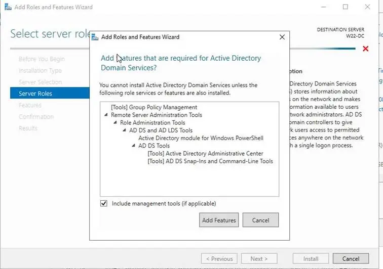 - Select Server Roles ekranında, “Active Directory Domain Services” rolünü işaretliyoruz. Bu rolü seçtiğimizde, “Add Roles and Features Wizard” ekranı otomatik olarak açılır ve Active Directory Domain Services rolü ile ilgili gerekli diğer özelliklerin (Features) kurulması gerektiğini belirtir.