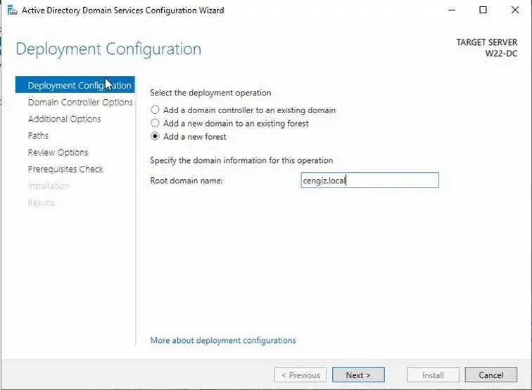 - Active Directory Domain Services Configuration Wizard açıldığında ilk olarak Deployment Configuration bölümü ile karşılaşıyoruz. Bu bölümde, yeni bir forestkurulumu, mevcut bir forestyeni bir domainekleme ya da mevcut bir domaine yeni bir domain controller ekleme seçenekleri sunulmaktadır.