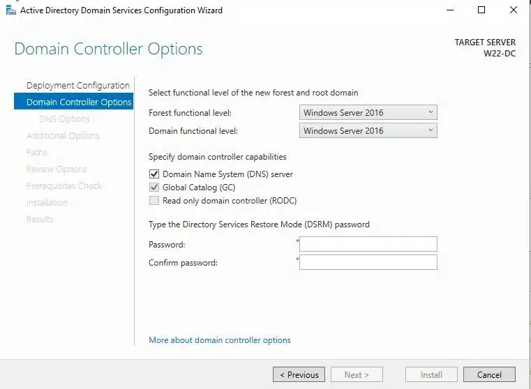 Örneğin, Windows Server 2016'da hem forest hem de domain functional level'ları aynı olarak Windows Server 2016 seçeneğinde gelirdi. Ancak, Windows Server 2019 ve Windows Server 2022'de bu seviyeleri Windows Server 2016 olarak görüyoruz ve burada bir değişiklik yapmıyoruz.