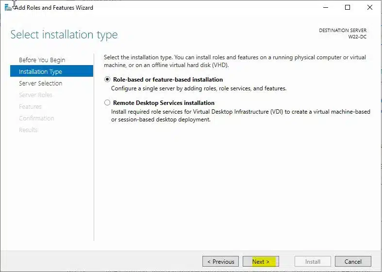 - Select Installation Type ekranında “Role-based or feature-based installation” seçeneğini tercih ediyoruz.