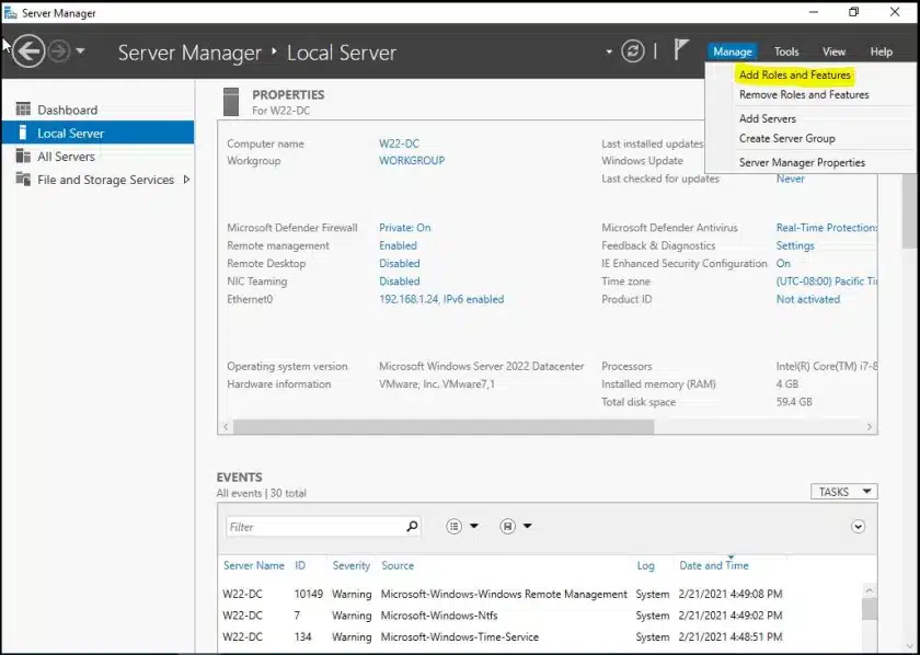 Sunucumuzun gerekli yapılandırmalarını tamamladıktan sonra, Server Managerkonsolunu açıyoruz. Sağ üst köşede yer alan “Manage” menüsünden “Add Roles and Features” seçeneğini kullanarak rol ekleme sihirbazını başlatıyoruz.