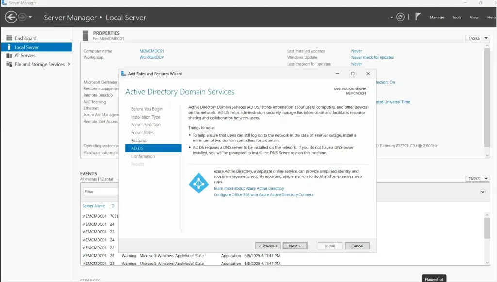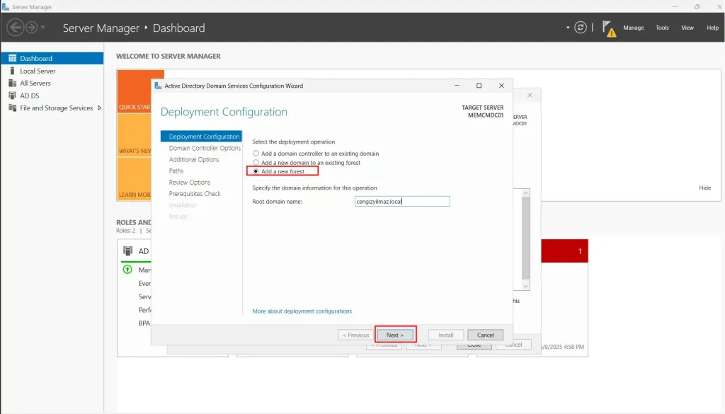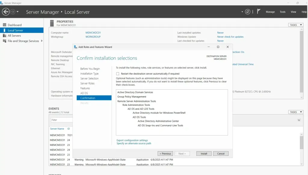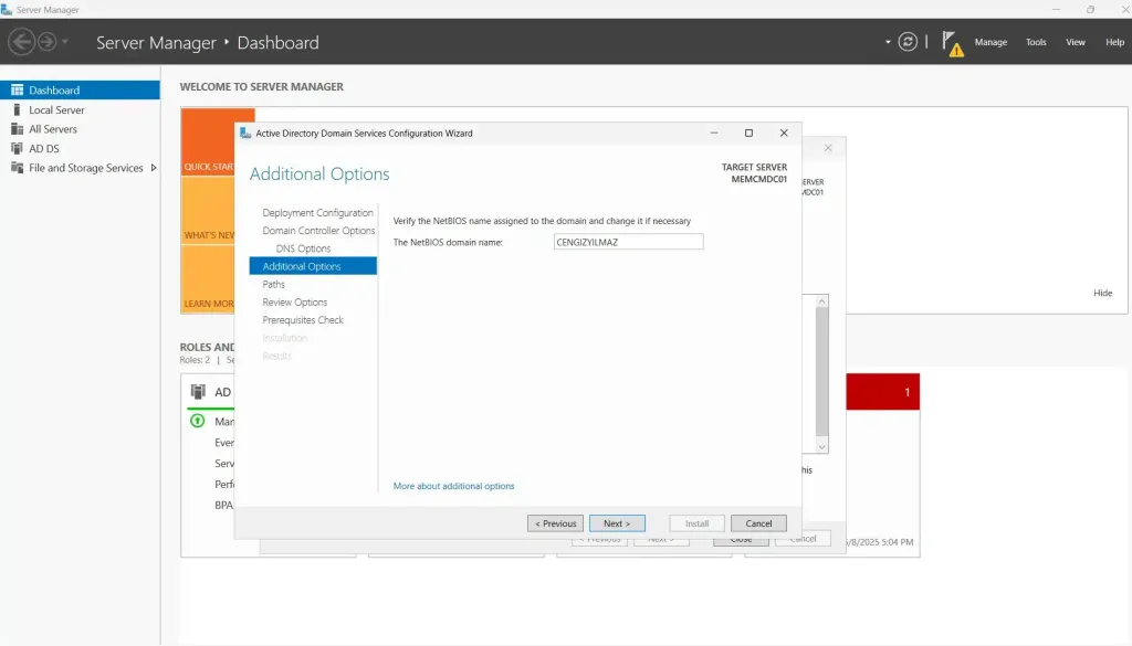 Install butonuna bastığınızda NTDS dosyaları oluşturulur, DNS servisi yapılandırılır ve Kerberos ilkesi yüklenir. Kurulum sonunda sunucu otomatik olarak yeniden başlar. İlk açılışta artık bir Domain Controller’dır.