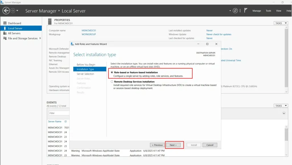 Role-based or feature-based installation kutucuğu, tek bir sunucuda (yerel ya da uzak) bireysel roller ve özellikler kurar; AD DS için standart yoldur.