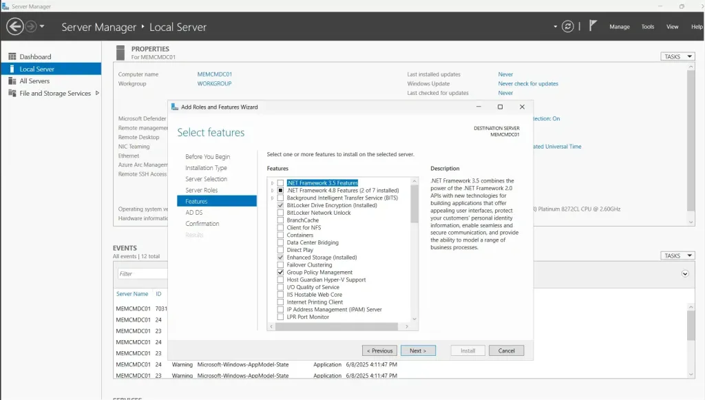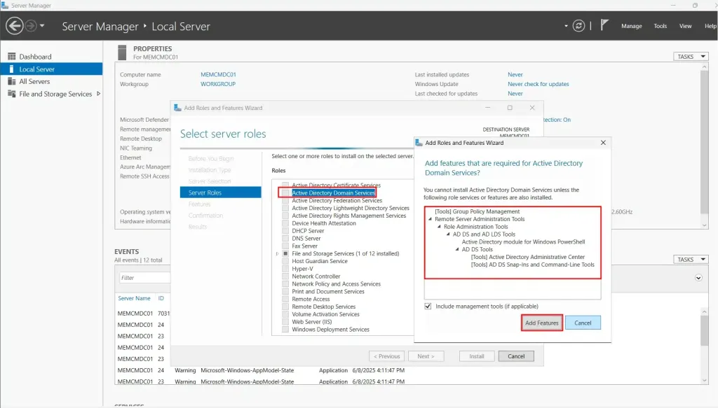 Bir sonraki sayfa, az önce otomatik eklenen bileşenleri gösterir. Bu ekranda fazladan özellik seçmeniz gerekmez; AD DS’nin tüm ön koşulları işaretlenmiş durumdadır. Herhangi bir değişiklik yapmadan Next ile ilerleyin.
