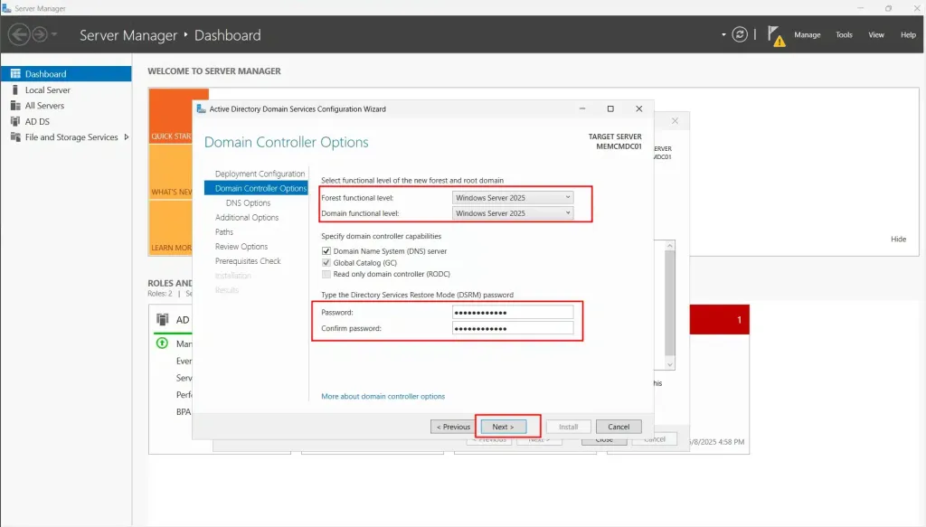 - Forest functional level ve Domain functional level listeleri, Windows Server 2025’i gösterir; değeri Windows Server 2025 (Level 10) olarak bırakıyoruz. Bu yeni seviye, 32 KB veritabanı sayfa boyutunu ve ek güvenlik geliştirmelerini etkinleştirir.