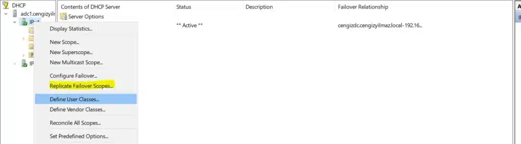 DHCP yönetim konsolunu açın. IPv4 nesnesine sağ tıklayarak **“Replicate Failover Scopes”** seçeneğini tıklayın. Bu işlem, iki sunucu arasındaki DHCP scope’larının replikasyonunu tetikler ve her iki sunucunun da güncel ve senkronize olduğundan emin olmanızı sağlar. Replikasyon işlemi, herhangi bir değişiklik yapıldığında manuel olarak da tetiklenebilir.