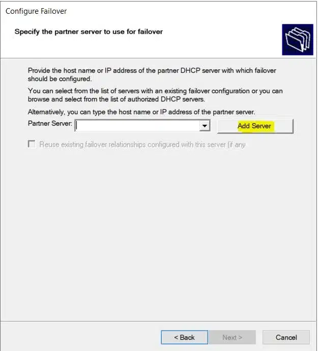 - **Specify the partner server** adımında **Add Server** ile partner sunucuyu ekleyin.