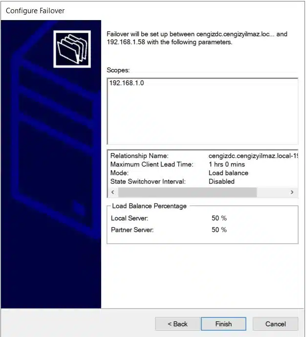 Summary ekranında gerçekleştirdiğiniz DHCP Failover yapılandırmalarınızı son bir kez gözden geçirin. Her şey doğru yapılandırıldıysa, “Finish” butonuna tıklayarak işlemi tamamlayın. Bu adım, konfigürasyonunuzu kaydeder ve DHCP Failover kurulumunuzu sonlandırır.