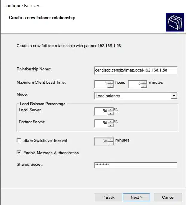 | Shared Secret | Sunucular arası DHCP Failover bağlantısında replikasyon için kullanılacak şifreyi belirler. Bu şifre, replikasyon verilerinin güvenliğini sağlamak amacıyla kullanılır. |