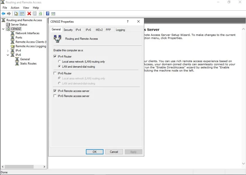 Bu işlemlerle beraber Windows Server üzerinde Remote Access Role kurulum sürecini tamamladık, şimdi Remote Accesskullanarak VPNyapılandırılmasını sağlayacağız.