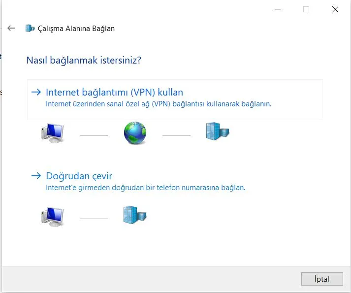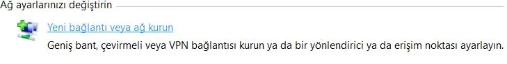 VPNbağlantısı kurma adımlarına geçiyorum. Windows’da Ağ ve Paylaşım Merkezi’ni açarak “Yeni bağlantı veya ağ kur” seçeneğine tıklıyorum. “İnternet’e bağlan” seçeneğini seçip ardından “VPN’imi kur” seçeneğini belirliyorum.