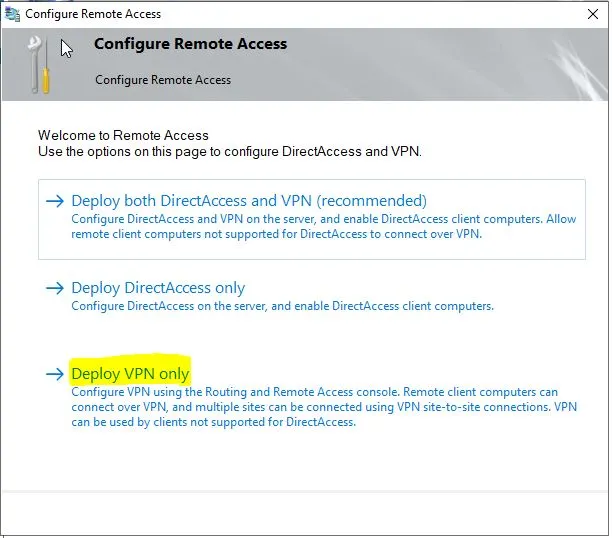 ‘Remote Access Management’ penceresinde, kullanım yönteminizi seçin. Eğer yalnızca VPN servisi sağlayacaksanız, “Deploy VPN only” seçeneğini tercih edilmesi gerekmektedir.