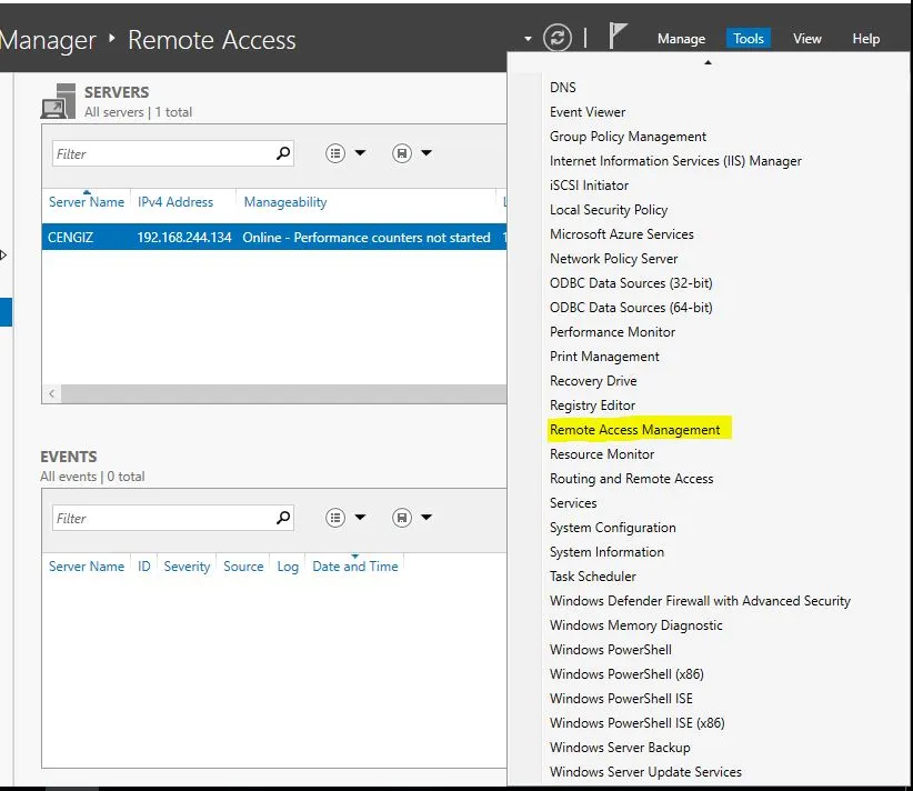 - Sunucunuz yeniden başladıktan sonra, ‘Server Manager‘ içerisindeki ‘Tools‘ menüsünden ‘Remote Access Management‘ aracını açarak yapılandırma işlemlerine başlayabilirsiniz.