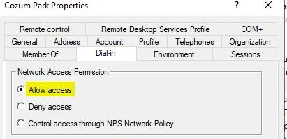 Dial-in sekmesinde, “Network Access Permission” bölümünde “Allow access” seçeneğini işaretliyorum. Bu ayar, belirlediğim kullanıcıların VPNüzerinden ağa bağlanmalarına olanak tanıyacaktır.