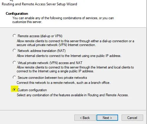 Yapılandırma sihirbazında, “Custom Configuration” seçeneğini seçerek devam ediyoruz. Bu seçenek, sunucuyu çeşitli ağ hizmetleri için özelleştirilmiş bir yapılandırma ile kurmamıza olanak tanımaktadır.